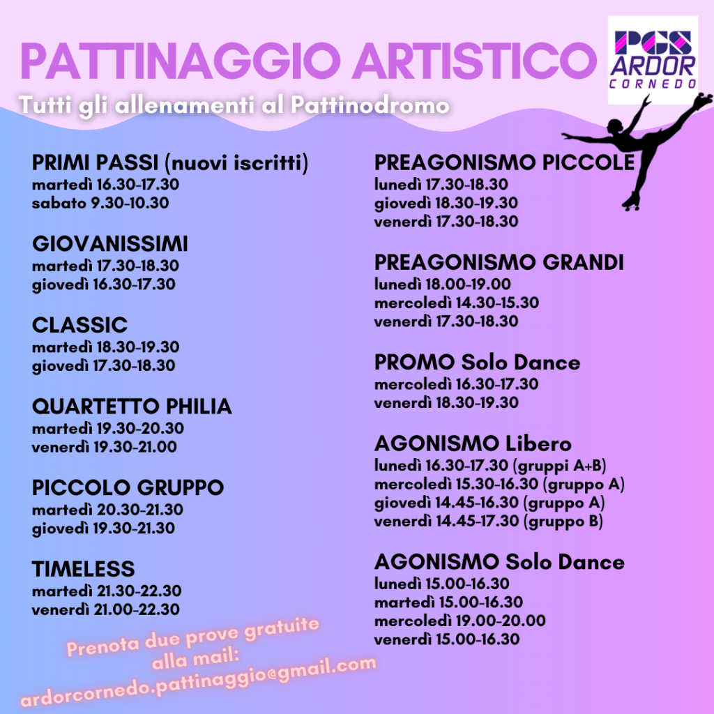 Pratichiamo il pattinaggio artistico a rotelle sia a livello amatoriale che agonistico, dai 4 anni in su e tutti i gruppi sono seguiti da allenatrici ben formate e con tesserino PGS e/o FISR (Federazione Italiana Sport Rotellistici).